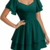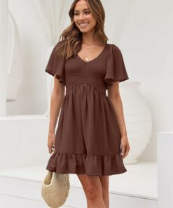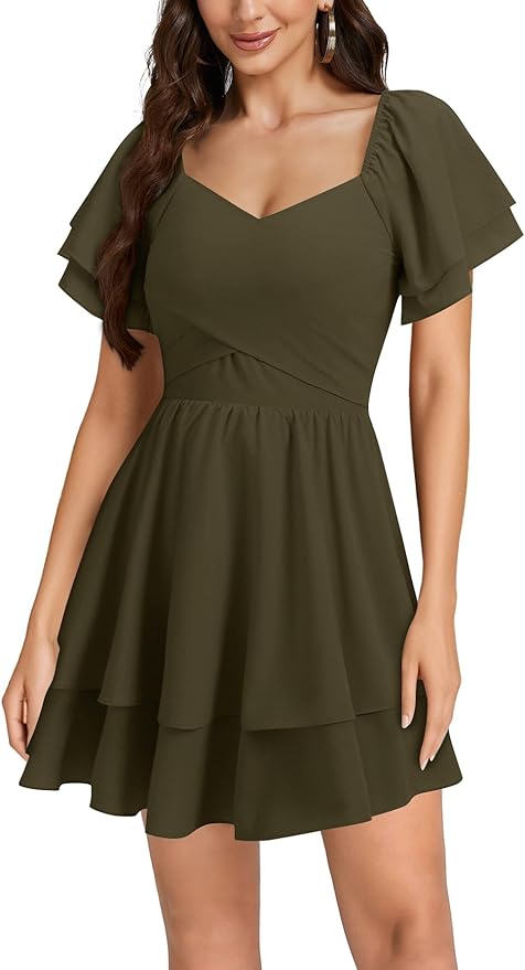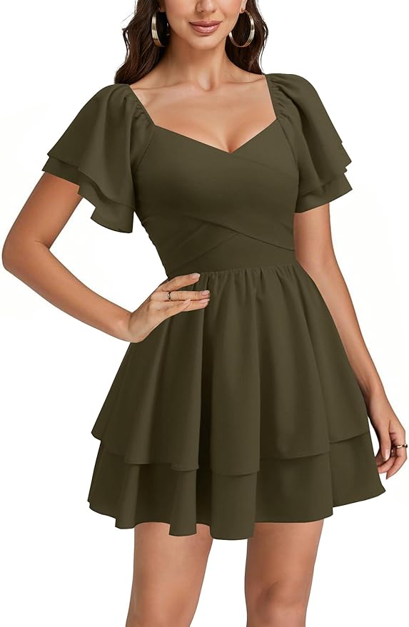 - Features:Layered, self tie up at back, v neck, wrap design, a line, flare short sleeve, swing flowy mini dress. Classic style with ruffle hem, the mini dress always offers a comfortable fit.