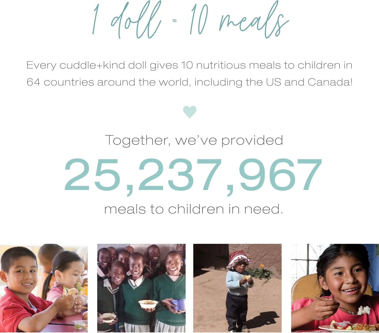 Each doll provides 10 meals to children in need across the globe. Our dolls are handcrafted by artisans in Peru and Nepal, ensuring fair trade wages and supporting over 1,000 artisans.