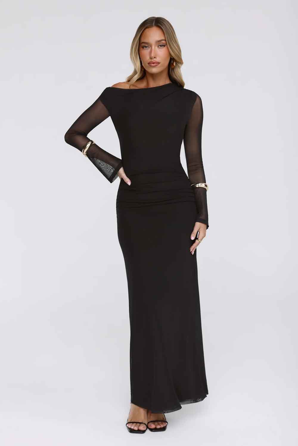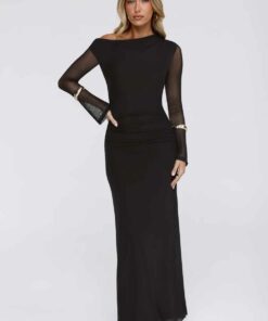 Effortlessly Influential Off Shoulder Mesh Long Sleeve Maxi Dress Black WD55