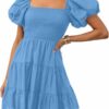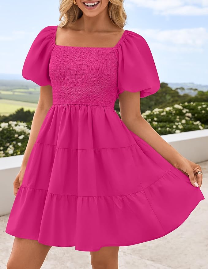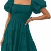 - Features: Tunic mini dress features smocked bodice, elastic high waist, short puff sleeve, solid color, flowy A line shape, swing mini length, square neck design, the sleeves can be pulled down for a sexy off shoulder look.