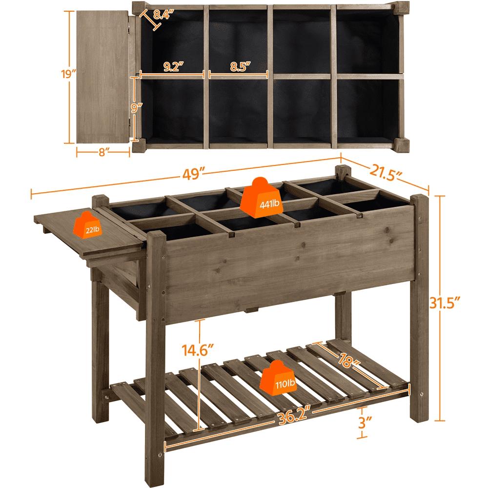 Features include an extended table ledge and bottom shelf for storing gardening tools, along with drainage holes for healthy plant growth. Suitable for use in yards, patios, balconies, decks, porches, and apartments.