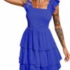 - Design: Mini-length, sleeveless, square-neck dress with smocked bodice, ruffle hem, and open back. Lined, high-waisted, and a-line silhouette. Tiered design adds flair.
