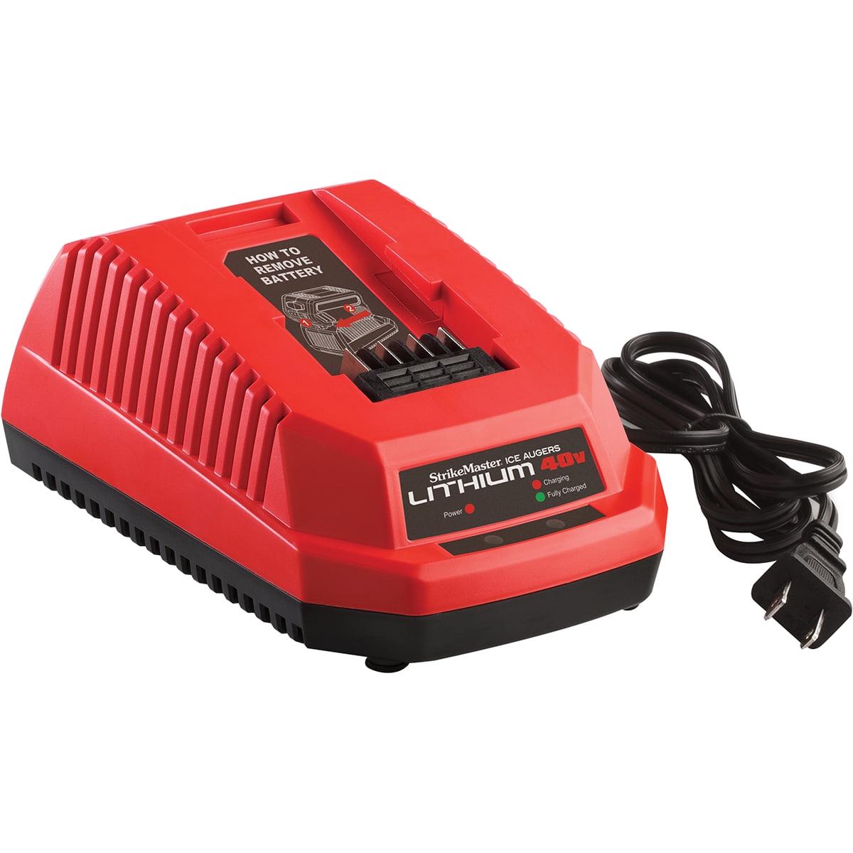 The StrikeMaster Lithium 40V Ice Auger is designed for efficient ice cutting, powered by a 40-volt, 5-amp hour lithium-ion battery. It features a reliable electric DC brushless motor, ensuring consistent speed and torque. The planetary gear system offers lightweight durability and high power density. This auger includes custom impact-resistant handles, a forward/reverse control, and a rapid charge battery station that recharges in 2.5 hours.
