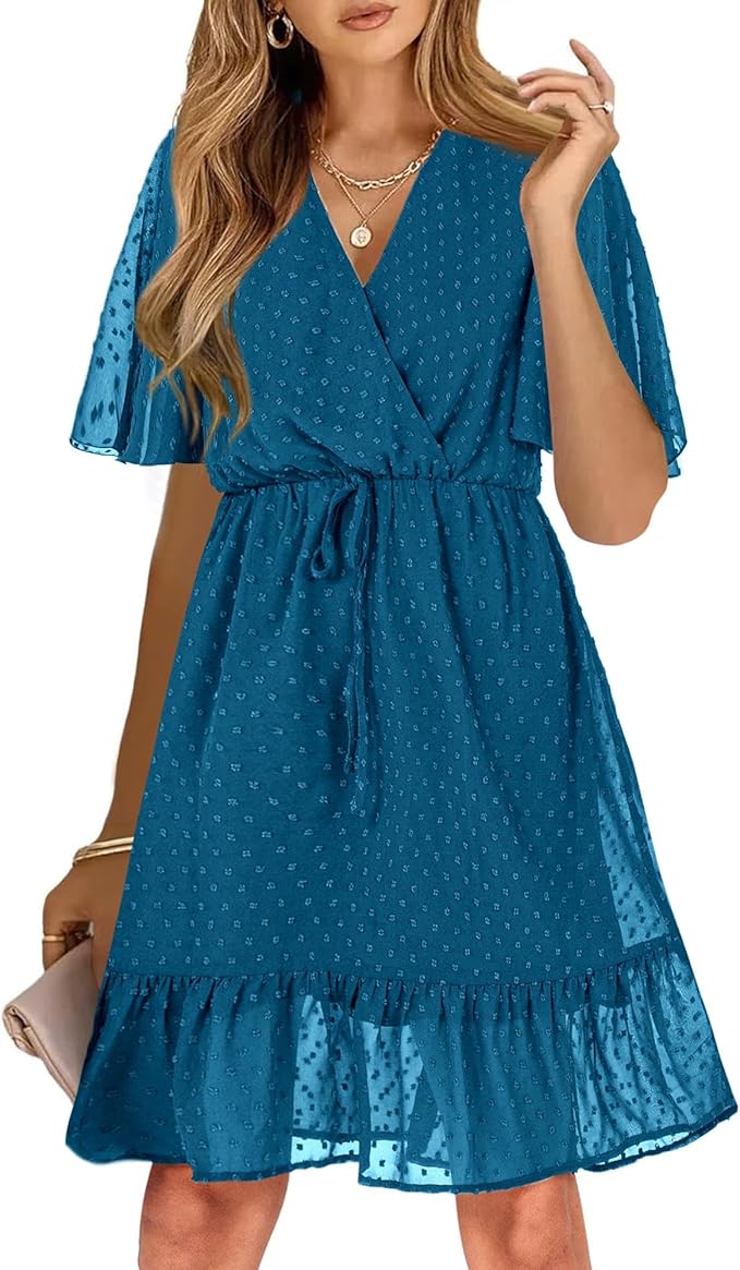 - Features – Wedding guest dress, spring dresses for women, sundresses for women, flowy summer dress, wrap dress for women short, cute dresses for women, flutter short sleeve, wrap v neck, bridal shower dress, elegant dresses for women, easter dresses for women, beach sun dress, mini length, safety button at v-neck, flowy and breathable 100% polyester fabric. With 100% polyester lining, ruffle hem, high waist with drawstring, loose fit, A-line sundress