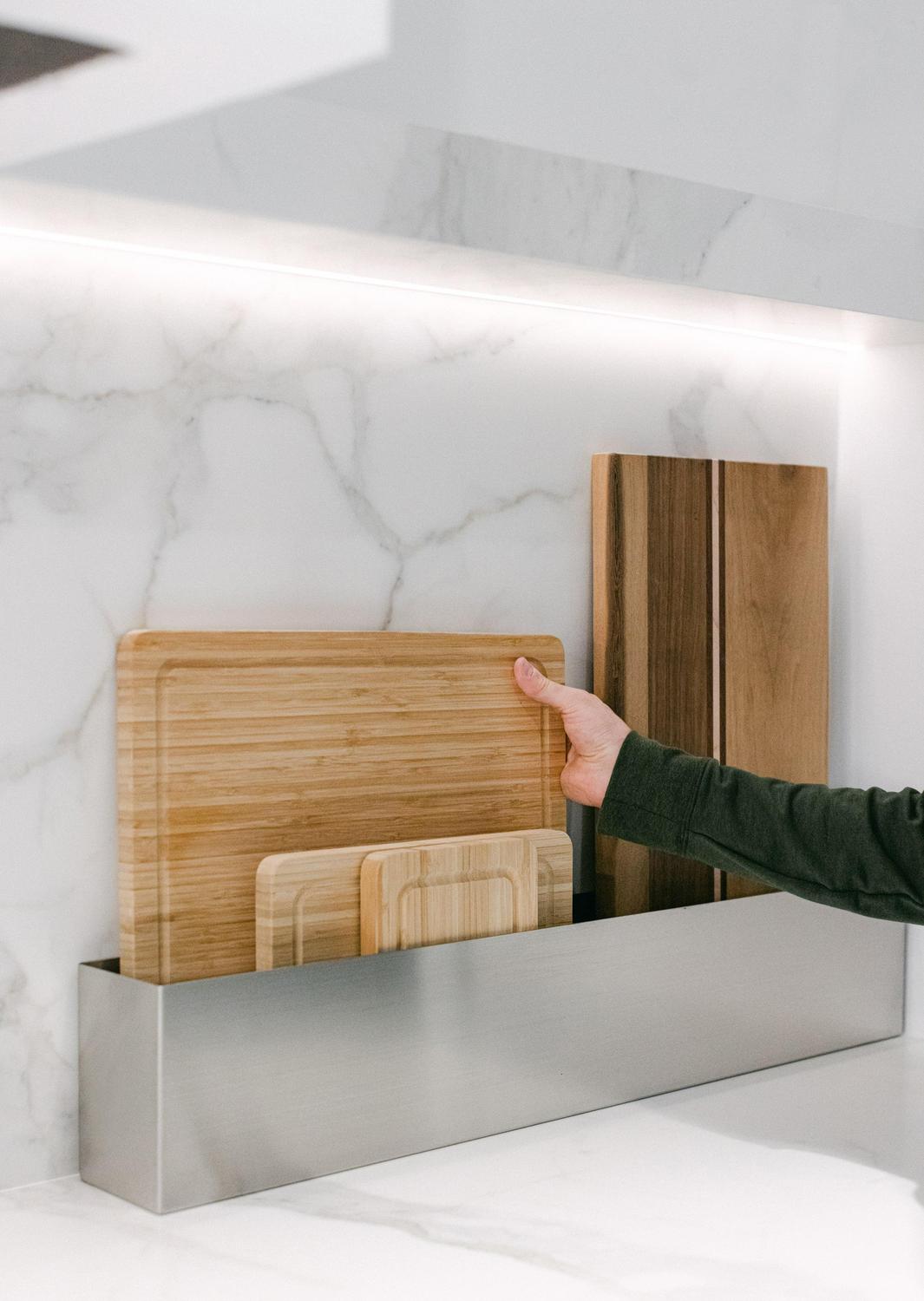 The GEO Trough Planter, with dimensions of 32L x 4W x 6H inches, offers a low, sleek profile suitable for tabletops, window sills, or mantles. Crafted from thick gauge brushed stainless steel, it can be used as a kitchen accent or table centerpiece. The planter is versatile enough for succulents, moss, or as a container for candles, fruit, or nuts. Part of the Metallic Series, it is solid yet lightweight.