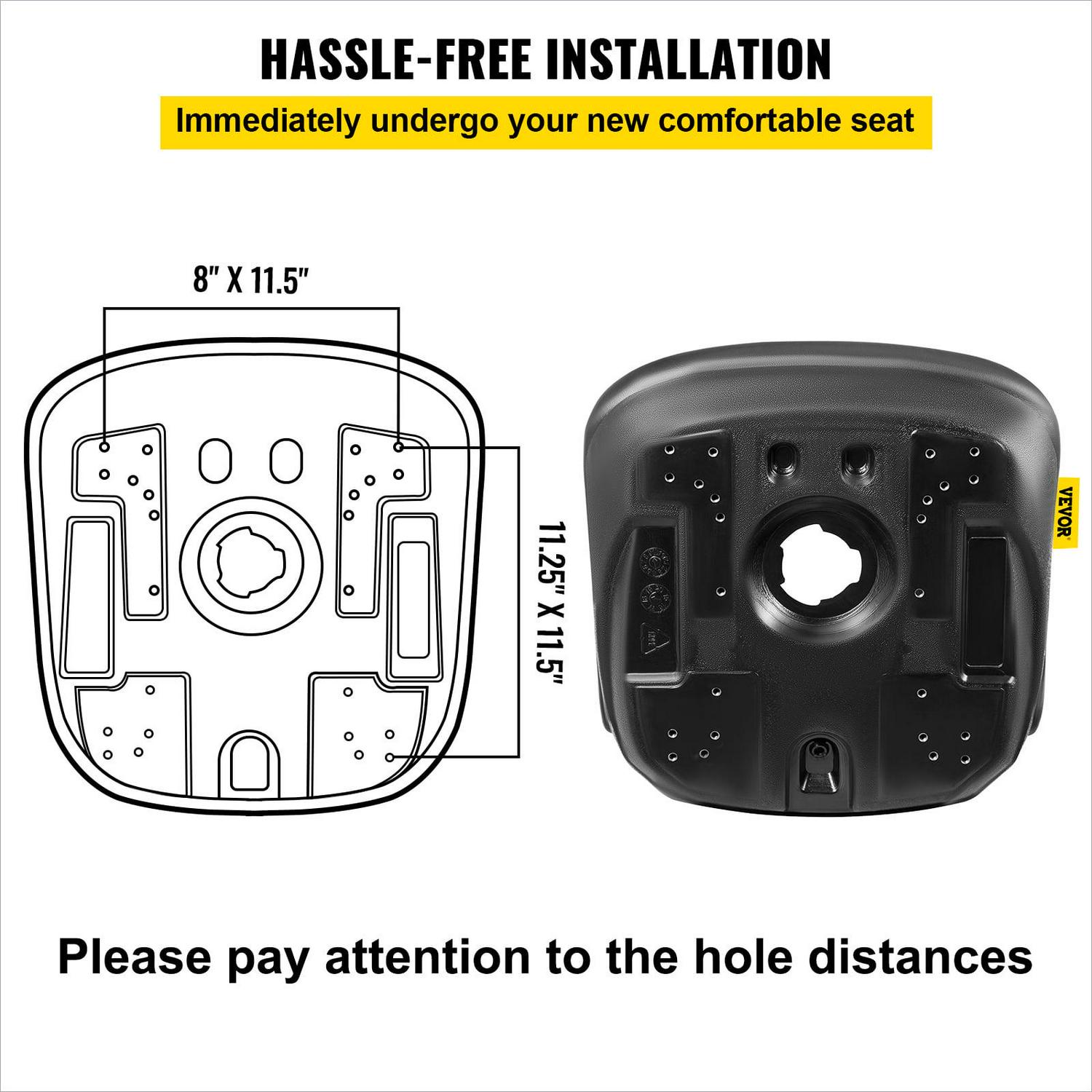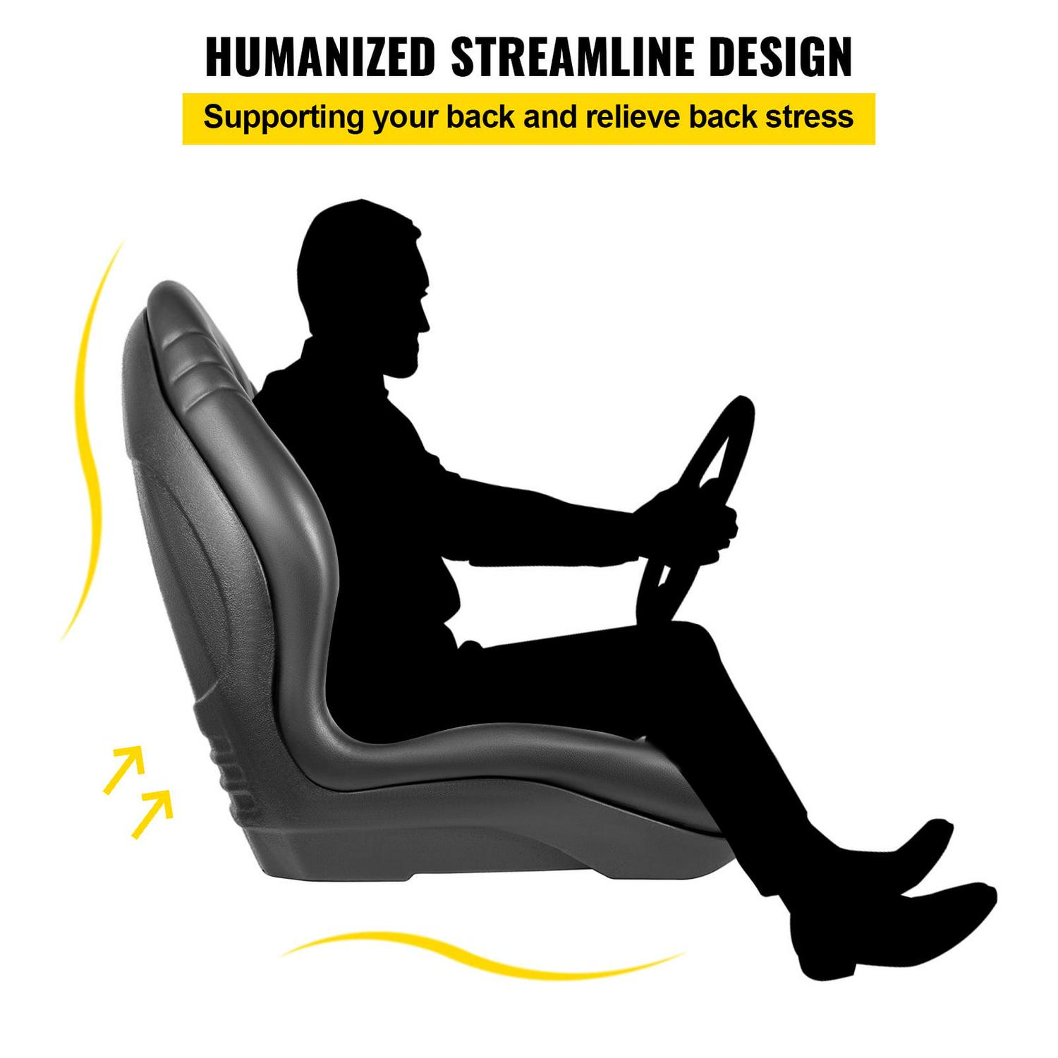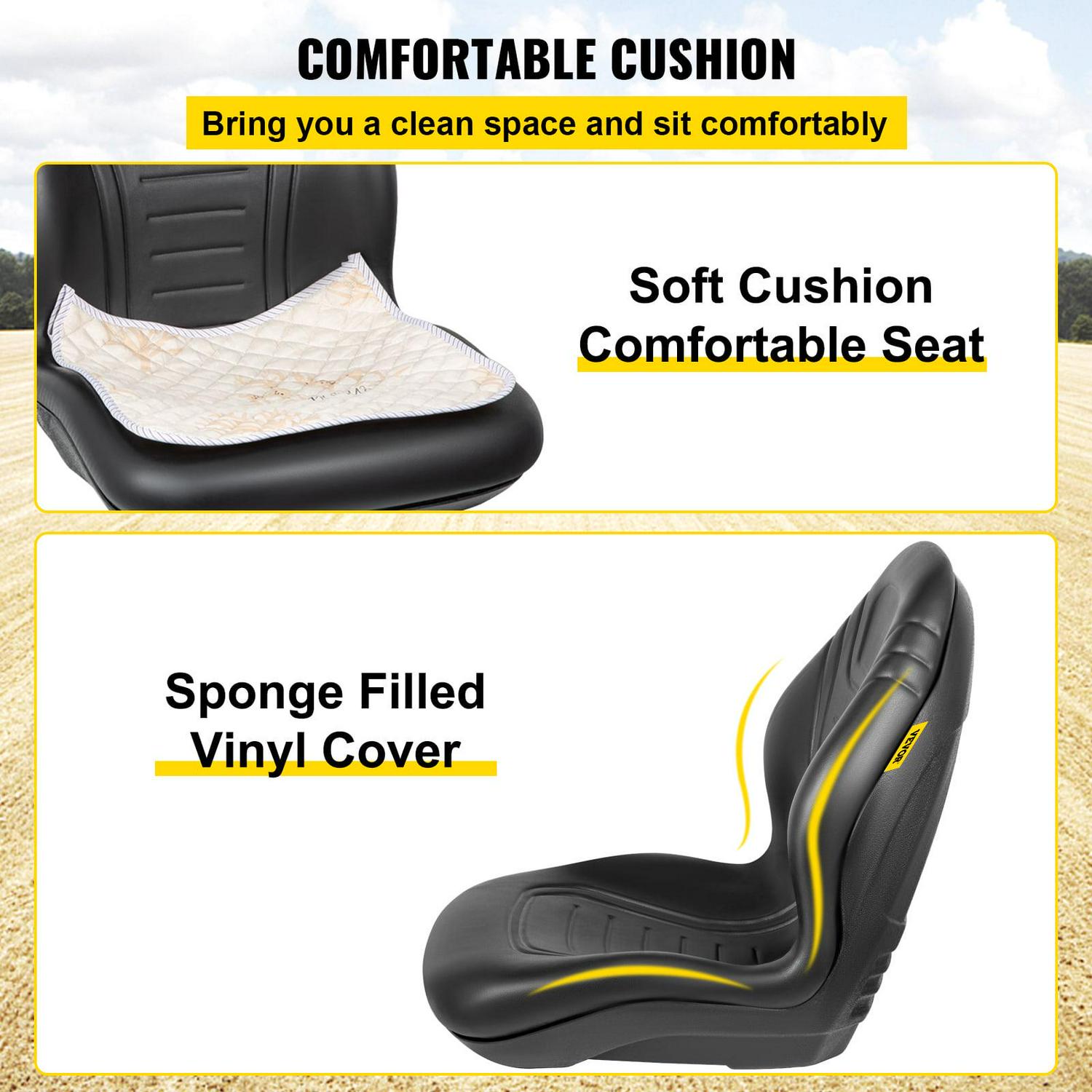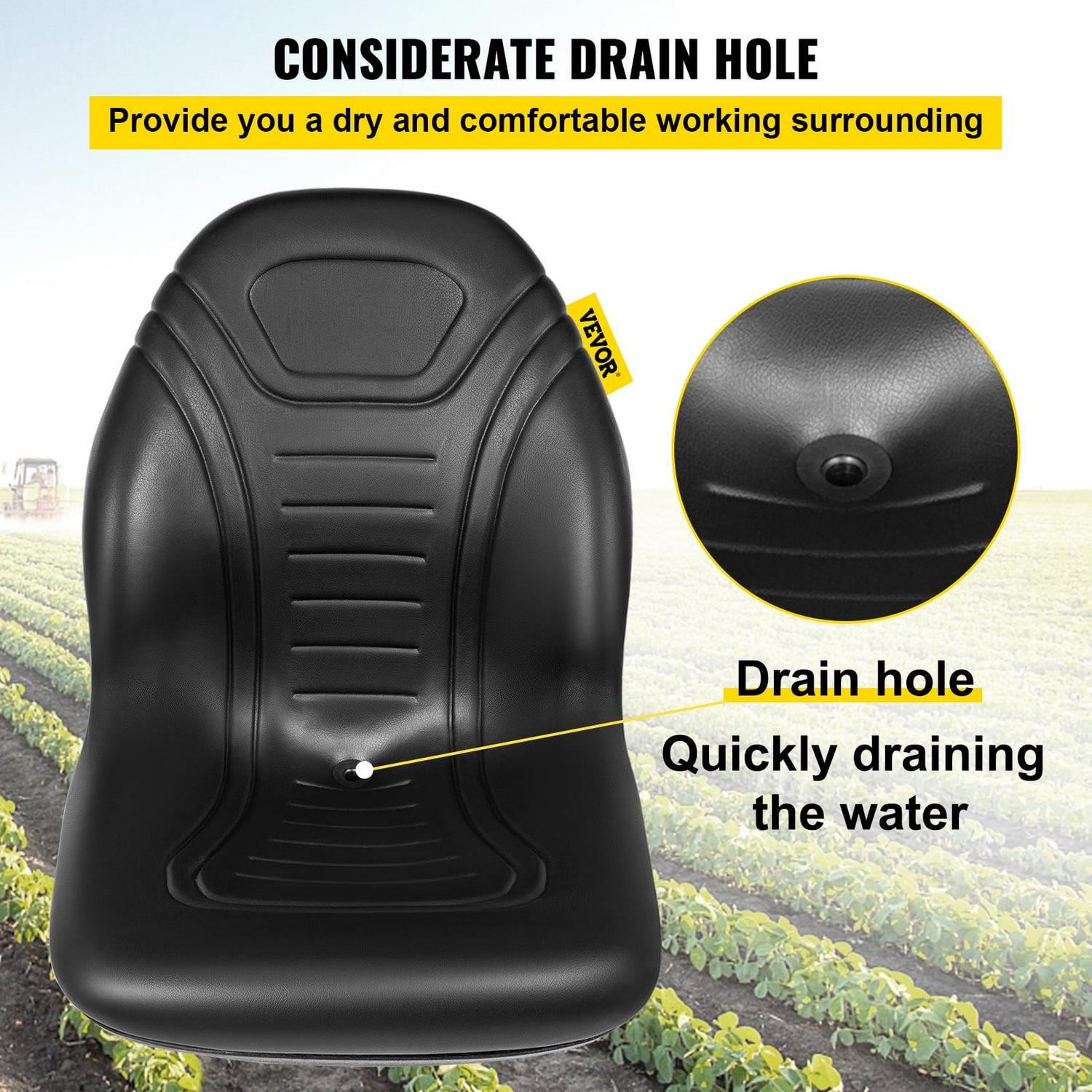 Upgrade your vehicle with the VEVOR Yamaha Tractor Seat, designed for comfort and durability. This high-back mower seat is made from premium black vinyl and features a drain hole for quick drying. It is compatible with various vehicles, including forklifts, mowers, and tractors.