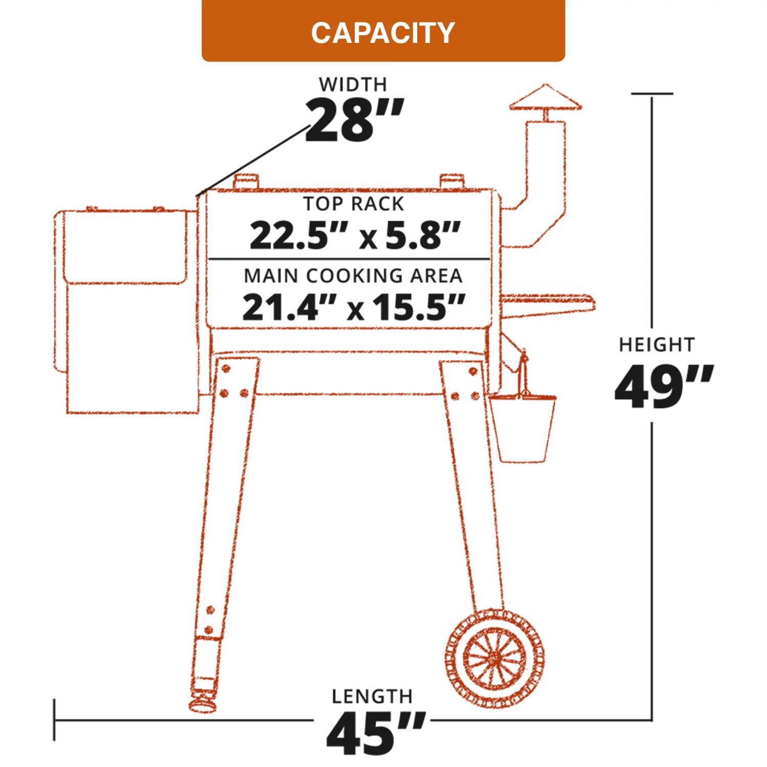 - 459 sq. in. grilling area, 20 lbs. hopper capacity